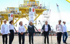 Ilustración Sheinbaum con Cuauhtémoc Cárdenas; Gobernadores Rocío Nahle y Américo Villarreal. Secretaria de Energía, Luz Elena González; Director de Pemex, Víctor Rodríguez; Jefe de la oficina de la presidencia, Lázaro Cárdenas Batel.