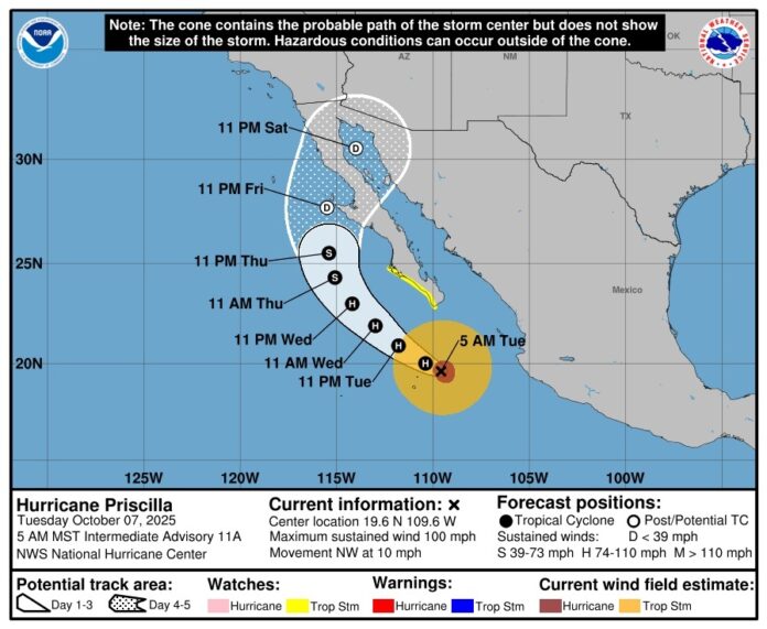 A través de redes sociales, la presidenta Claudia Sheinbaum Pardo informó que se prevé que el huracán Priscilla se intensifiqué para llegar a categoría 3; se registra su desplazamiento en paralelo a la costa occidental de Baja California Sur.