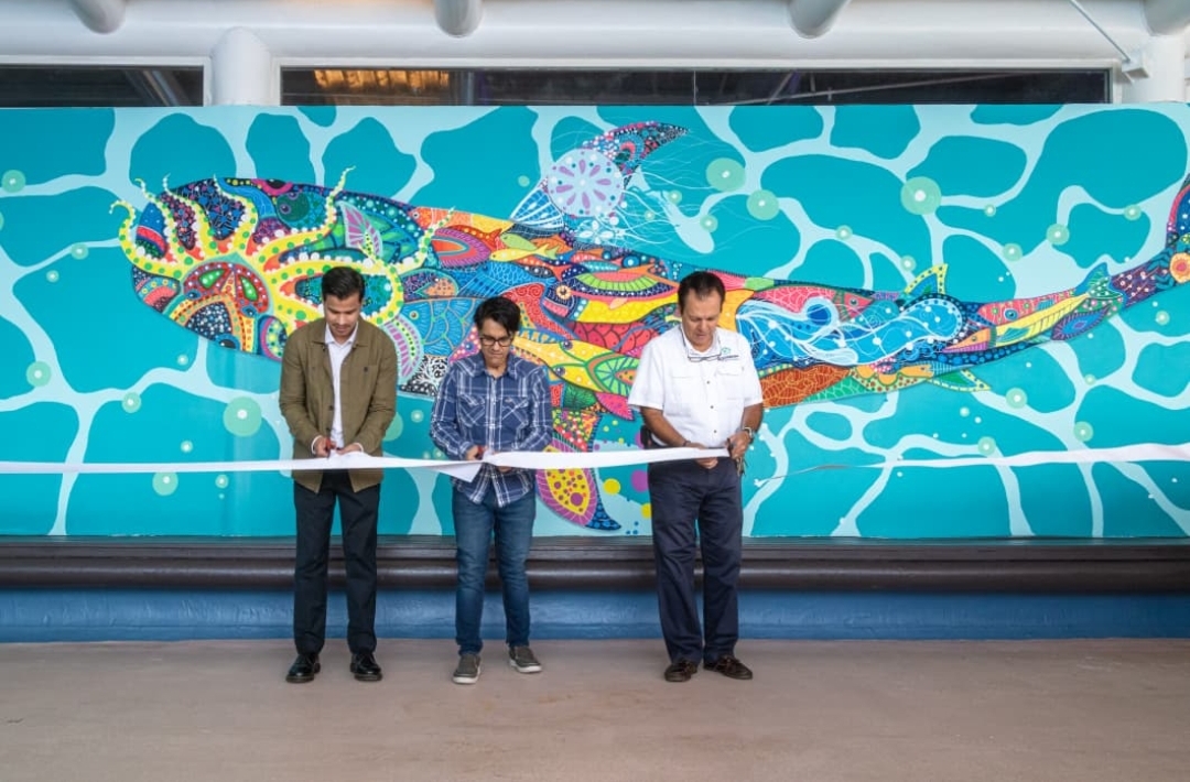 La obra, realizada por el pintor veracruzano Rubén Saldaña, plasma diferentes especies emblemáticas que habitan en el Aquarium, representando la belleza y vitalidad del Golfo de México.