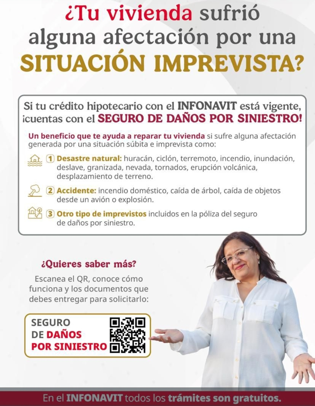 Veracruz, a 17 de octubre de 2025. El INFONAVIT llama a las personas que tengan un crédito hipotecario vigente, cuyas casas hayan sido afectadas por las fuertes lluvias registradas en Veracruz, principalmente en la zona norte del estado, a hacer válida la cobertura del Seguro de Daños con la que cuenta su financiamiento.