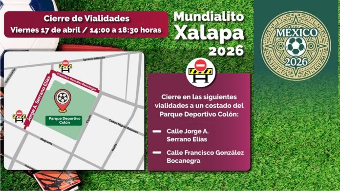 Xalapa, Ver., 15 de abril de 2026.- Ante el inicio del Mundialito Xalapa 2026, se informa a la población que el viernes 17 de abril habrá cortes a la circulación vial en la zona del Parque Deportivo Colón, por lo que se exhorta a automovilistas tomar rutas alternas y anticipar sus traslados.