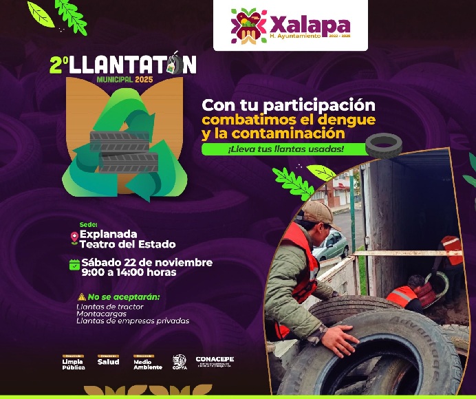 18.11.2025 Xalapa, Ver.- Con el objetivo de contribuir a la eliminación de los criaderos del mosco transmisor del dengue, zika y chikungunya, y promover el manejo adecuado de residuos, el Ayuntamiento de Xalapa invita al segundo Llantatón Municipal 2025.