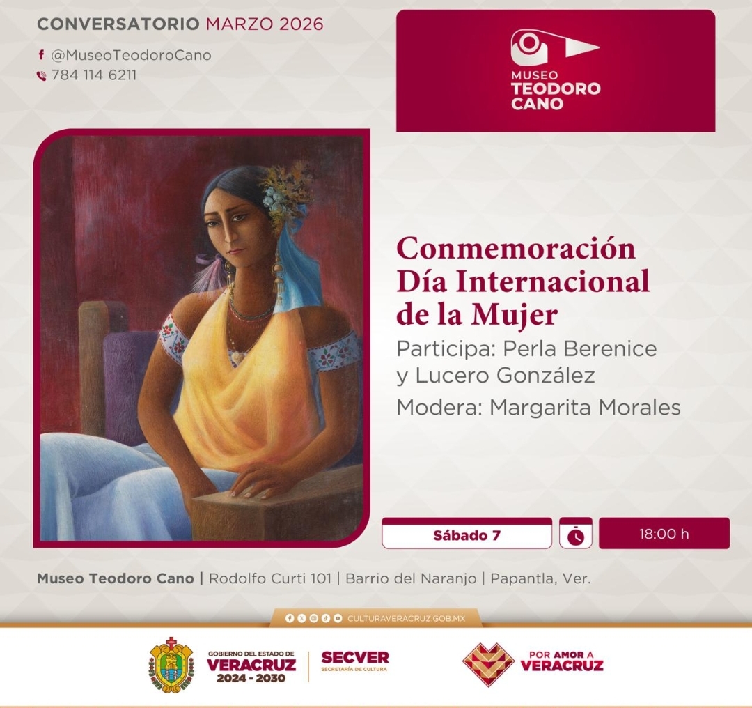 Xalapa, Ver., 06 de marzo de 2026.- La Secretaría de Cultura de Veracruz (SECVER) invita al público general al Conversatorio Conmemoración del Día Internacional de la Mujer, el sábado 07 de marzo a las 18:00 horas, en el Auditorio del recinto cultural Museo Teodoro Cano, en Papantla. La entrada es libre.