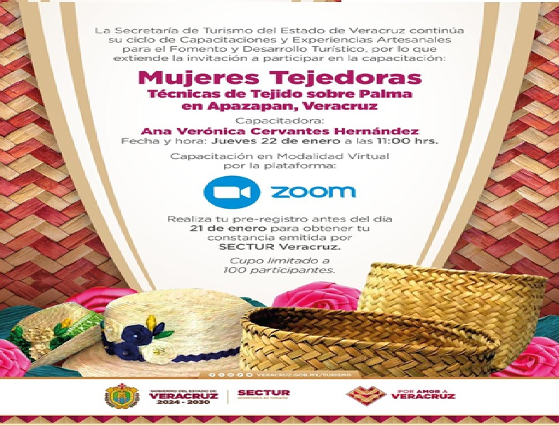 Xalapa, Ver., 16 de enero de 2026.- La Secretaría de Turismo (SECTUR) invita a participar en la capacitación Mujeres Tejedoras: Técnicas de tejido sobre palma en Apazapan, que impartirá Ana Verónica Cervantes Hernández a través de la plataforma Zoom, el jueves 22 de enero a las 11:00 horas.
