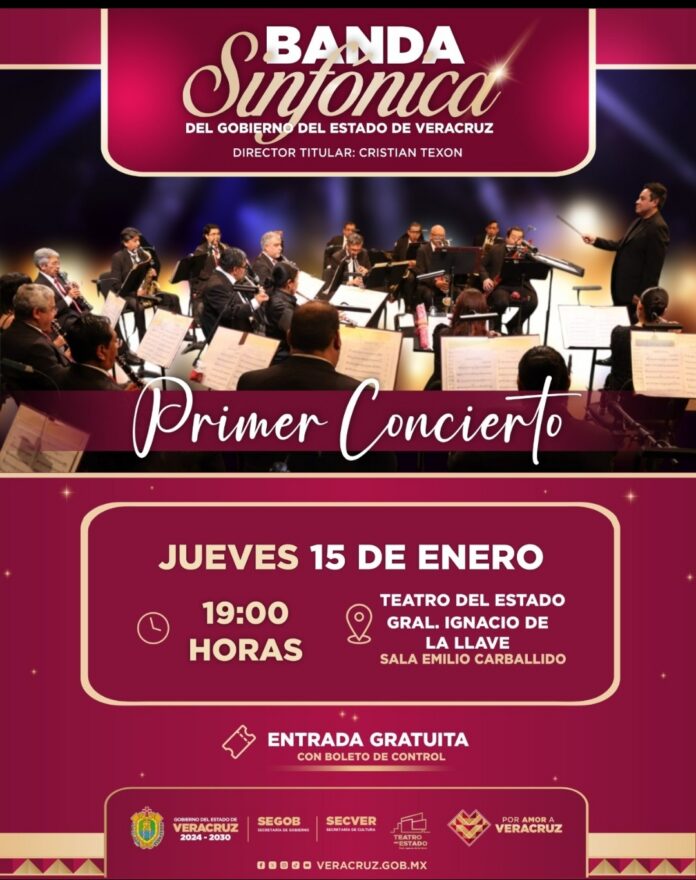 Xalapa, Ver., 14 de enero de 2026.- La Secretaría de Cultura de Veracruz (SECVER), en coordinación con la Coordinación de Promoción de Valores Cívicos y Culturales de la Secretaría de Gobierno, invita al Primer Concierto de la Banda Sinfónica del Gobierno del Estado de Veracruz, que se llevará a cabo el día de mañana, a las 19:00 horas, en la Sala Emilio Carballido del Teatro del Estado General Ignacio de la Llave.
