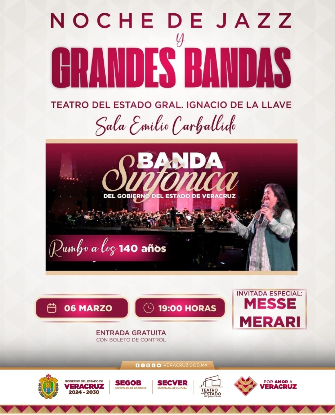 Xalapa, Ver., 04 de marzo de 2026.- La Secretaría de Cultura de Veracruz (SECVER), en colaboración con la Coordinación de Valores Cívicos y Culturales de la Secretaría de Gobierno, invita al Concierto Noche de Jazz y Grandes Bandas, a cargo de la Banda Sinfónica del Gobierno del Estado de Veracruz, el viernes 06 de marzo, a las 19:00 horas, en la Sala Emilio Carballido del Teatro del Estado General Ignacio de la Llave.
