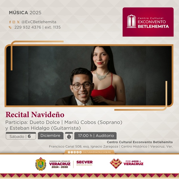 Por la tarde, a las 17:00 horas, el Dueto Dolce, conformado por la soprano Marilú Cobos y el guitarrista Esteban Hernández Hidalgo, quienes ofrecerán un Recital Navideño con un programa que incluye música clásica y sacra, agregando un toque festivo y de gran calidad artística para deleite de los asistentes.