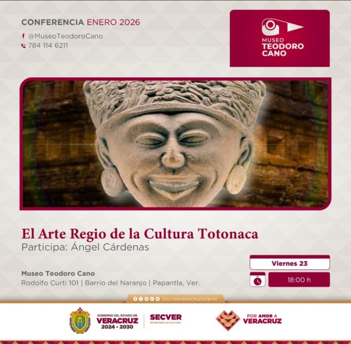 Xalapa, Ver., 20 de enero de 2026.- La Secretaría de Cultura de Veracruz (SECVER) invita al público en general a participar en la conferencia El Arte Regio de la Cultura Totonaca, el próximo viernes 23 de enero, a las 18:00 horas, en las instalaciones del Museo Teodoro Cano, de Papantla. La entrada es libre.