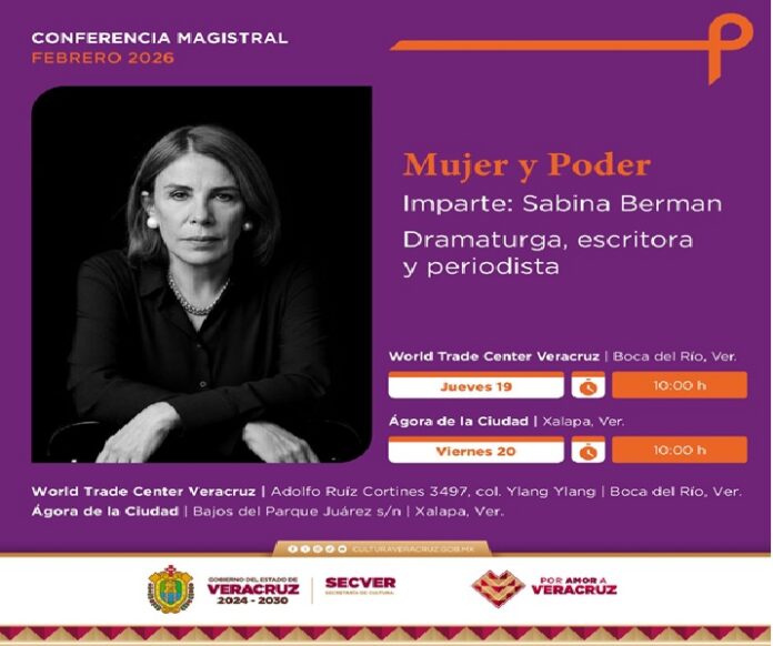 Xalapa, Ver., 17 de febrero de 2026.- La Secretaría de Cultura (SECVER) invita a la ciudadanía a asistir a la conferencia magistral Mujer y Poder, impartida por la reconocida escritora, dramaturga y periodista mexicana Sabina Berman, que se llevará a cabo el jueves 19 y viernes 20 de febrero a las 10:00 horas en Boca del Río y Xalapa.