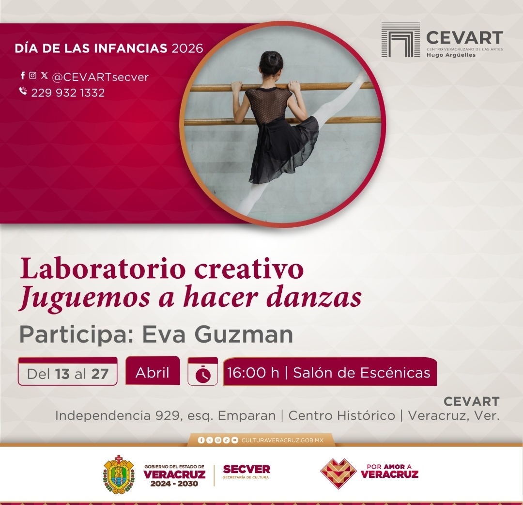 Xalapa, Ver., 07 de abril de 2026.- La Secretaría de Cultura de Veracruz (SECVER) invita a la serie de laboratorios creativos y seminarios en torno a la danza, que se llevarán a cabo en el Centro Veracruzano de las Artes Hugo Argüelles (CEVART), en la ciudad de Veracruz, en el marco del Día Internacional de la Danza. La entrada es libre.
