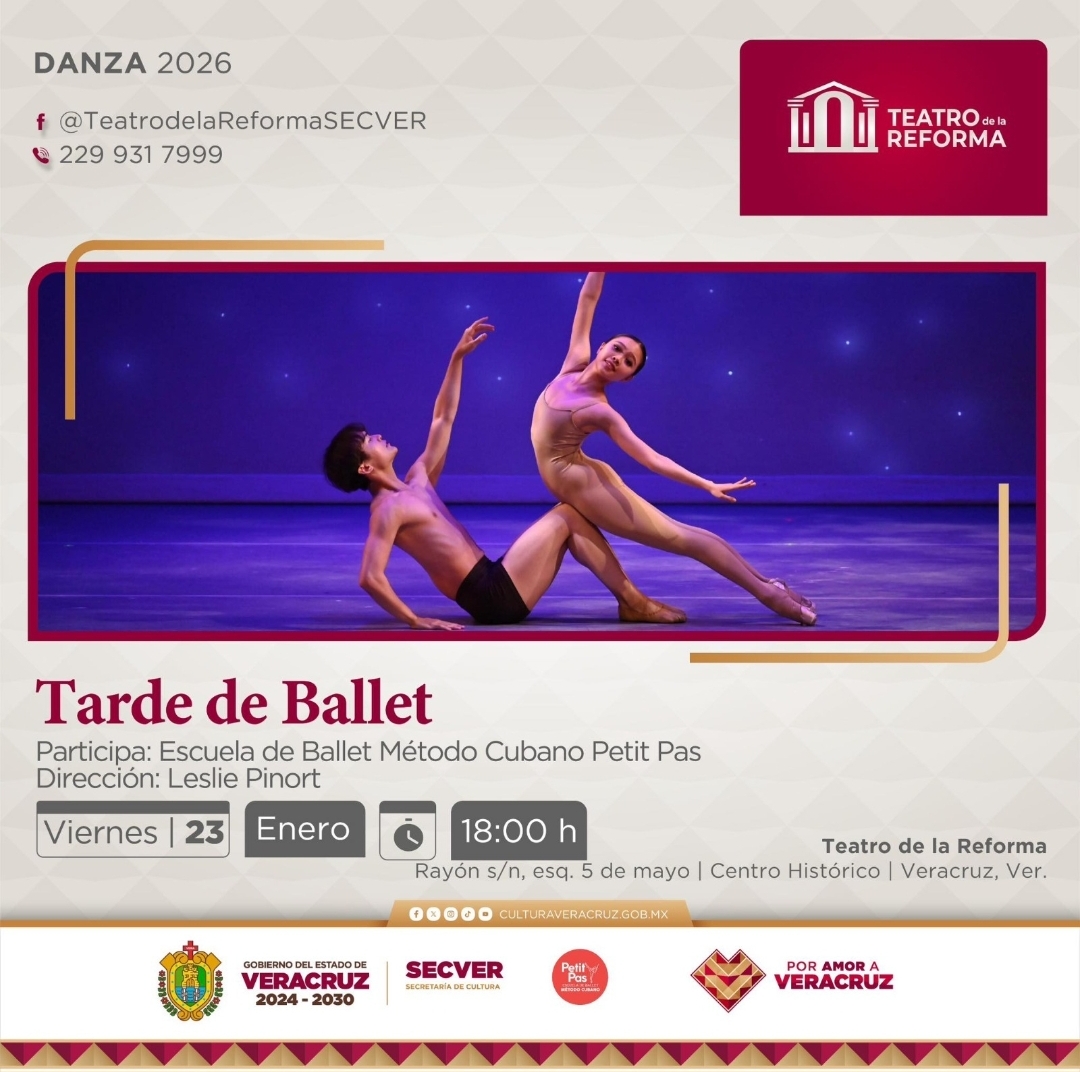Xalapa, Ver., 22 de enero de 2026.- La Secretaría de Cultura de Veracruz (SECVER) invita a asistir al recital de danza Tarde de Ballet, de la Escuela de Ballet Método Cubano Petit Pas, a presentarse este viernes a las 18:00 horas, en la Sala Principal del Teatro de la Reforma, en el puerto de Veracruz. La entrada es libre.