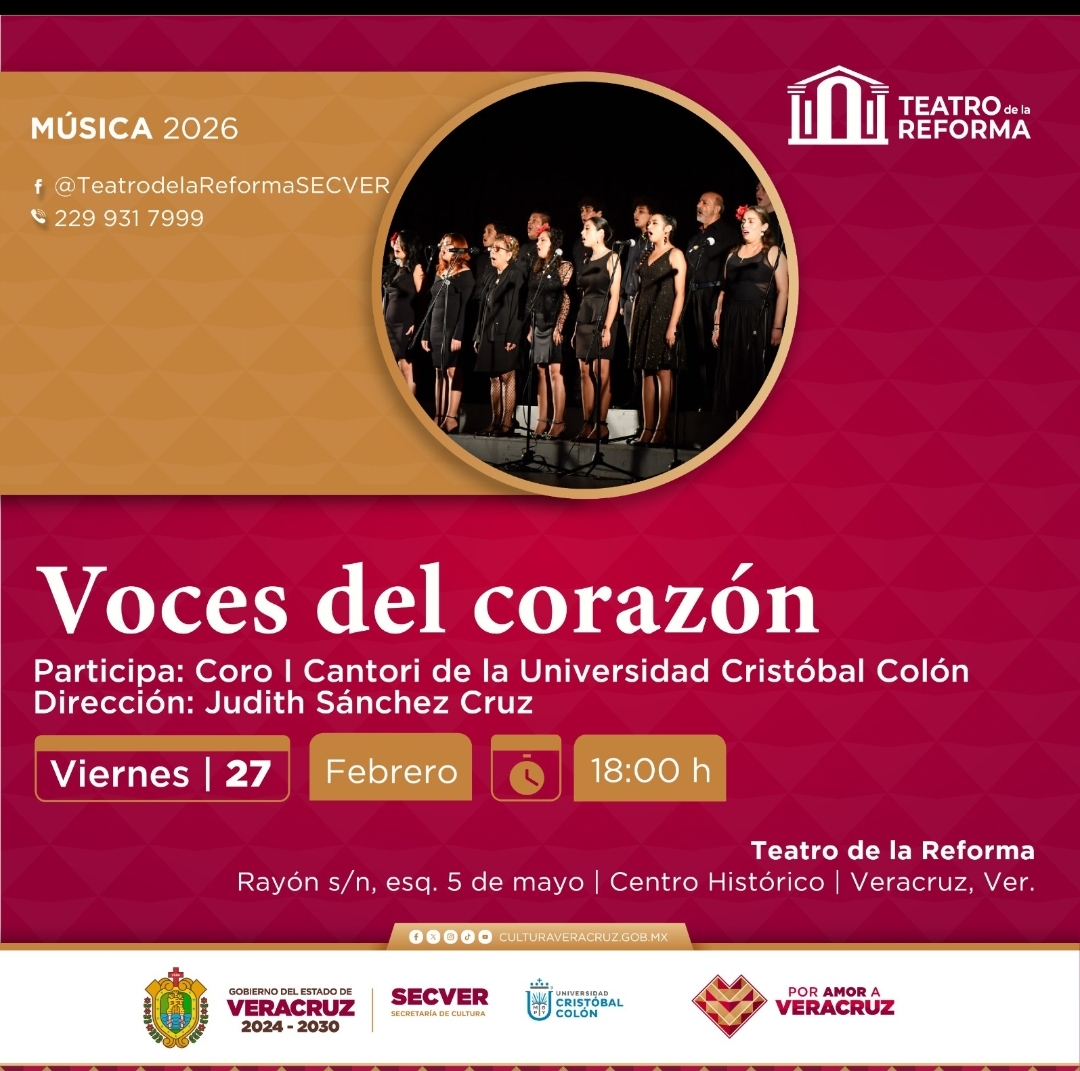 Xalapa, Ver., 25 de febrero de 2026.- La Secretaría de Cultura de Veracruz (SECVER) invita a la presentación del canto Voces del Corazón, el viernes 27 de febrero a las 18:00 horas, en el Vestíbulo del Teatro de la Reforma, en el puerto de Veracruz.