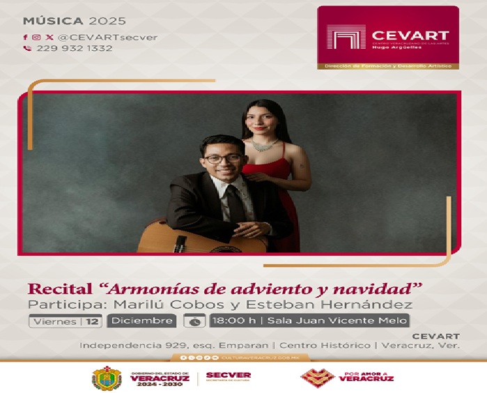 Xalapa, Ver., 11 de diciembre de 2025.- La Secretaría de Cultura de Veracruz (SECVER) invita al público en general a compartir un momento especial en el Recital Armonías de Adviento y Navidad, este viernes a las 18:00 horas, en el Centro Veracruzano de las Artes Hugo Argüelles (CEVART). La entrada es gratuita.