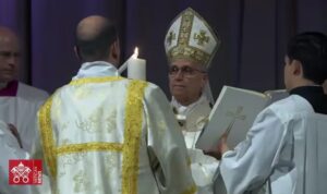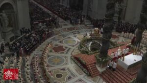 En el pórtico de la basílica arde el fuego en el brasero; el Papa lo bendice para que se encienda en el corazón de los fieles el deseo de unirse a Cristo, vencedor del pecado y de la muerte. Una costumbre, ya presente en culturas precristianas, que se convierte en ocasión para alabar a Dios y alimentar la fraternidad y la alegría. Según lo previsto en el rito del «lucernario», León XIV graba en el cirio una cruz, la primera y la última letra del alfabeto griego, el Alfa y el Omega, y las cifras del año en curso. A continuación, clava en el cirio, en forma de cruz, cinco granos de incienso. Que la luz de Cristo resucitado en gloria disipe las tinieblas del corazón y del espíritu: es la invocación que se entrelaza, en lo más íntimo de los fieles, con los ecos de los conflictos y la violencia que abrasan el mundo.