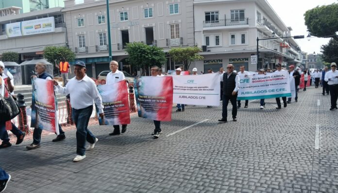 24.03.2016 Xalapa, Ver.- Un grupo de jubilados de confianza de la Comisión Federal de Electricidad (CFE) en Veracruz se manifestó para exigir la revisión de la propuesta de reforma al artículo 127 constitucional, al considerar que vulnera sus derechos adquiridos y pone en riesgo el Estado de Derecho.