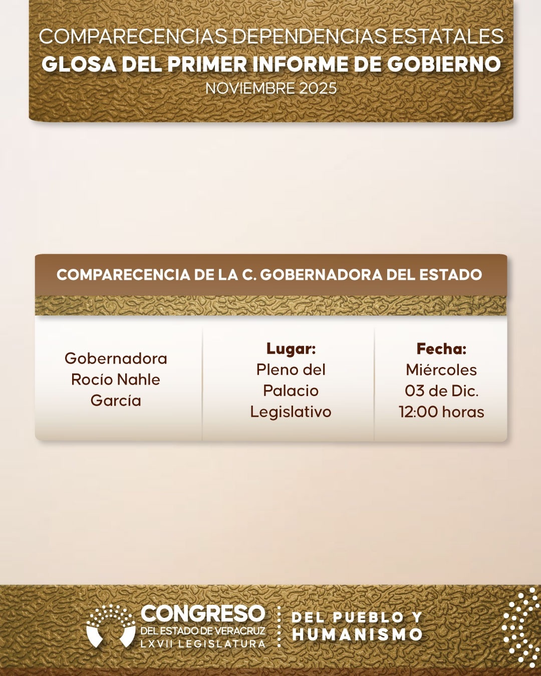 La glosa del Primer Informe de Rocío Nahle, que se desarrollará del 18 al 28 de noviembre, culminará con su comparecencia ante el Pleno el 3 de diciembre. Será el primer gran examen político de su administración, y también la primera prueba del nuevo formato aprobado por la LXVII Legislatura.