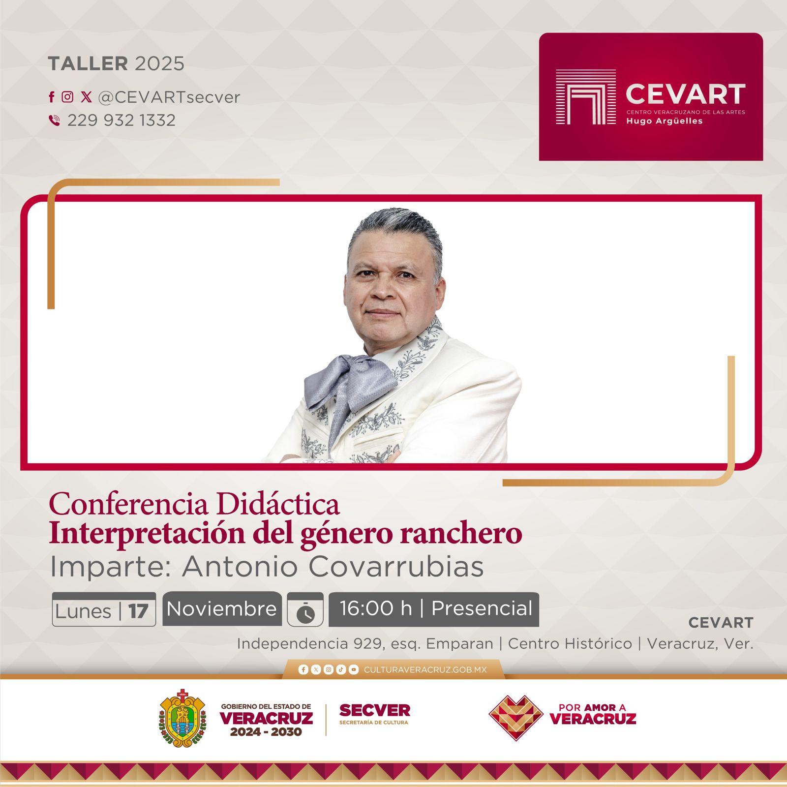 Veracruz, Ver. 16 de noviembre de 2025.- La Secretaría de Cultura de Veracruz (SECVER) invita al público a participar en el laboratorio creativo Conferencia didáctica: Interpretación del género ranchero, el lunes 17 de noviembre, a las 16:00 horas, en el Centro Veracruzano de las Artes Hugo Argüelles (CEVART), en el puerto de Veracruz. El taller es totalmente gratuito y requiere registro anticipado.