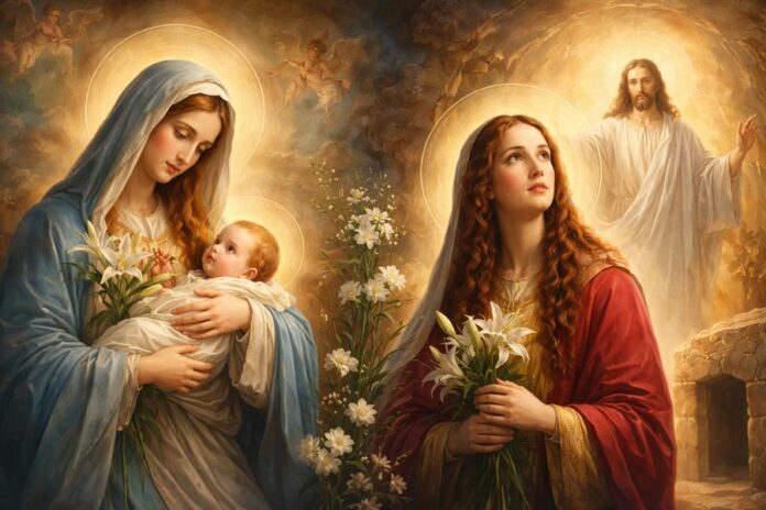 En los relatos de la resurrección, María Magdalena aparece como testigo directo del acontecimiento central del cristianismo, mientras que la Virgen María no figura explícitamente en esos textos, aunque la tradición posterior la vincula espiritualmente a ese momento. Por eso, desde una lectura simbólica, puede decirse que una está asociada al comienzo de la vida de Cristo y la otra al anuncio de su victoria sobre la muerte, lo que da forma al mensaje cristiano.