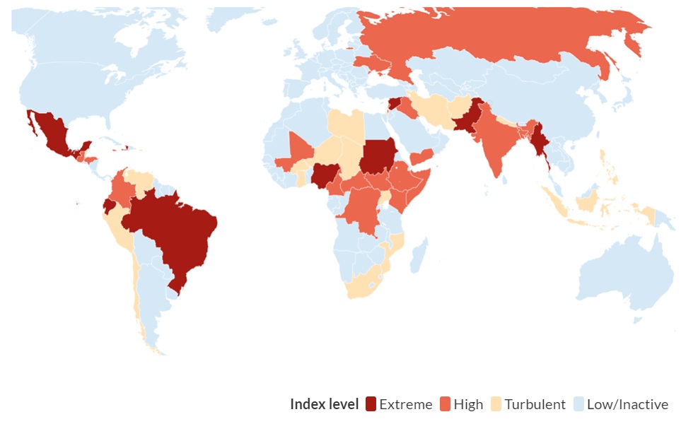 La permanencia de México en este nivel refleja, según ACLED, una combinación de disputas criminales, reacomodos internos en organizaciones delictivas y un repunte sostenido de agresiones contra autoridades locales y jovenes en México.