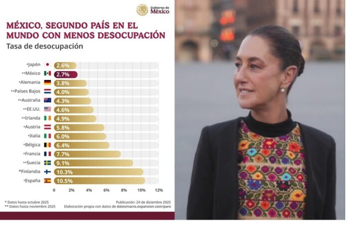 26.12.2025 México.- La presidenta Claudia Sheinbaum difundió en redes sociales un comparativo internacional que coloca a México en el segundo lugar mundial en menor tasa de desocupación. Según los datos compartidos, el país cerró noviembre de 2025 con 2.7% de desempleo, cifra que representa alrededor de 1.6 millones de personas dentro de la población económicamente activa. Japón aparece en primer lugar con 2.6% hasta octubre.