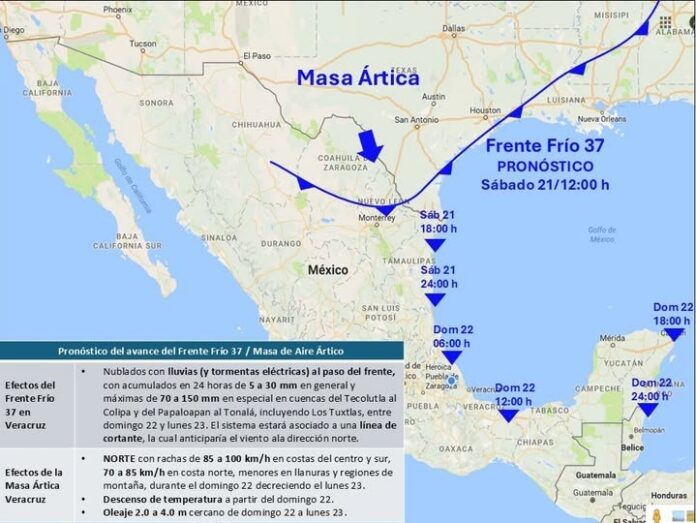 En Veracruz, el ingreso del frente frío se prevé para el domingo 22 de febrero, con lluvias fuertes, tormentas eléctricas y un evento de norte que alcanzará rachas de hasta 100 kilómetros por hora en la zona conurbada Veracruz–Boca del Río.
