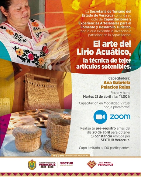 Xalapa, Ver., 11 de abril de 2026.- La Secretaría de Turismo (SECTUR) invita a participar en el curso El arte del lirio acuático: técnica para tejer artículos sostenibles, que se llevará a cabo el martes 21 de abril a las 11:00 horas, como parte del ciclo Capacitaciones y experiencias artesanales para el fomento y desarrollo turístico.