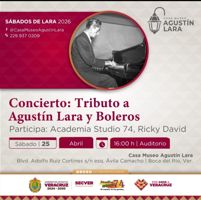 Xalapa. Ver., 23 de abril de 2026.- La Secretaría de Cultura de Veracruz (SECVER) invita al concierto Tributo a Agustín Lara y al Bolero, que se realizará este próximo sábado, a las 17:00 horas, en el auditorio de la Casa Museo Agustín Lara, en Boca del Río. La entrada es gratuita.