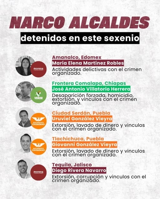 La infografía que circula con los nombres de al menos cinco alcaldes detenidos en lo que va del sexenio no es sólo un recuento policial: es el mapa visible de una red que durante años se normalizó bajo el disfraz de la política local. Amanalco, Frontera Comalapa, Ciudad Serdán, Tlachichuca y Tequila no son casos inconexos; son eslabones de un mismo patrón: autoridades municipales capturadas por el crimen organizado, ya sea por complicidad, por omisión o por franca asociación.