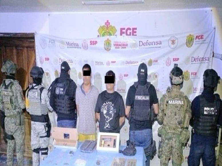 Durante la implementación de cateos en apoyo a la Fiscalía General del Estado (FGE), fueron detenidas dos personas, asegurándoseles un arma de fuego corta, cargadores y cartuchos útiles; 28 dosis y una bolsa con sustancia con características del cristal; además de un camión, un semirremolque, un tractocamión, una caja seca y un contenedor.