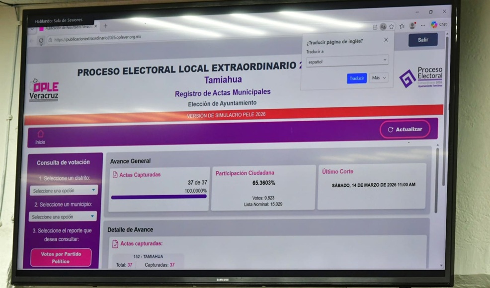 Xalapa, Ver., 14 de marzo 2026.- En seguimiento al Proceso Electoral Local Extraordinario 2026 (PELE 2026), la Consejera Electoral y Presidenta de la Comisión de Capacitación y Organización Electoral, Maty Lezama Martínez, supervisó, desde la Sala de Sesiones del Consejo General del Organismo Público Local Electoral del estado de Veracruz (OPLE Veracruz), el simulacro del Sistema de Cómputo Municipal que se realizó en la sede del Consejo Municipal de Tamiahua.