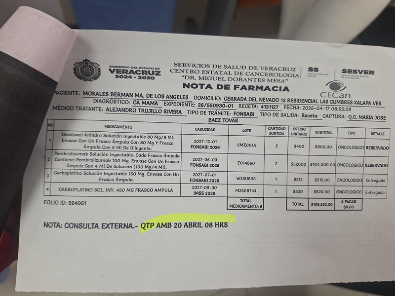 20.04.2026 Xalapa, Ver.- Pacientes que reciben tratamiento oncológico en el Centro Estatal de Cancerología Dr. Miguel Dorantes Mesa (CECAN) manifestaron su inconformidad ante el desabasto de insumos indispensables para la aplicación de quimioterapias, situación que ha provocado retrasos e incluso la suspensión de sesiones médicas.