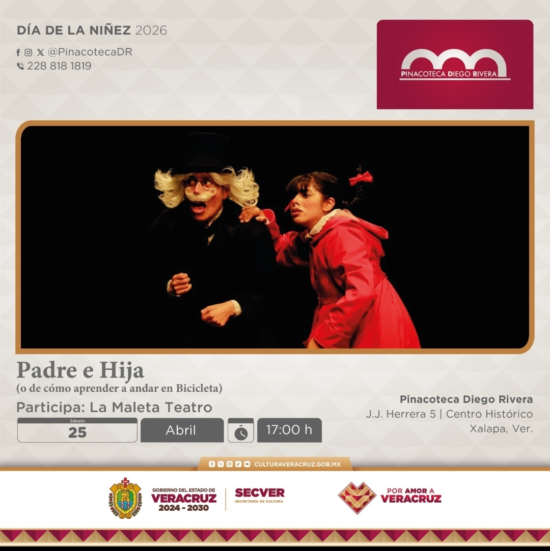 Xalapa, Ver., 23 de abril de 2026.- La Secretaría de Cultura de Veracruz invita a la puesta escénica Padre e hija (o de cómo aprender a andar en bicicleta), a cargo de la compañía La Maleta Teatro, que se presentará este sábado, a las 17:00 horas, en la Pinacoteca Diego Rivera, en el marco del Día de las Infancias. La entrada es gratuita.