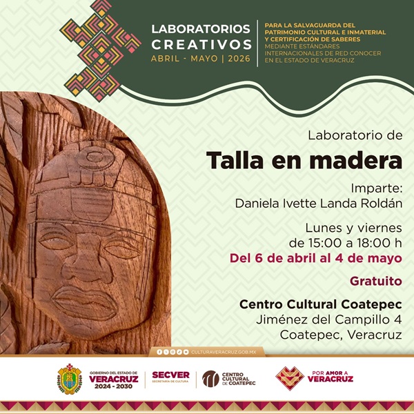 Xalapa, Ver., 09 de abril de 2026.- La Secretaría de Cultura de Veracruz (SECVER) invita a participar en los Laboratorios Creativos de Talla en madera, iniciativa gratuita que se desarrolla de abril a noviembre en distintas regiones del estado, para salvaguardar el patrimonio cultural inmaterial en riesgo.