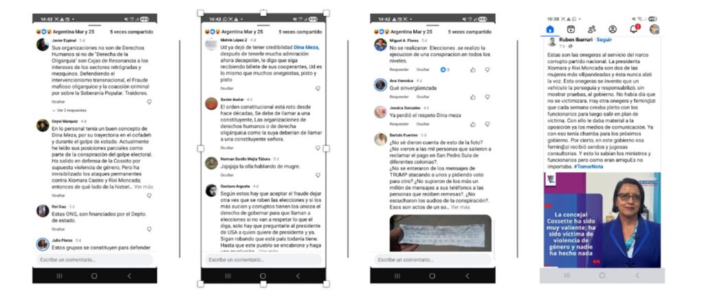 Artículo 19 documenta que el 17 de diciembre, Meza y Jiménez acudieron a la Fiscalía Especial para la Protección de los Defensores de Derechos Humanos, Periodistas, Comunicadores Sociales y Operadores de Justicia para formalizar la denuncia. Tras este hecho, la comunicadora comenzó a recibir mensajes ofensivos en Facebook que buscan desacreditar su labor periodística y de defensa de derechos humanos. Los ataques incluyen insultos en razón de género y acusaciones de pertenecer a un supuesto “fraude mafioso oligárquico”.