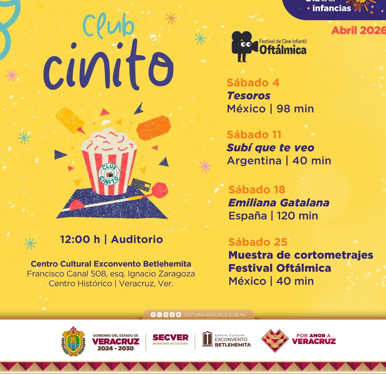 Xalapa, Ver., 10 de abril de 2026.- La Secretaría de Cultura de Veracruz (SECVER), en colaboración con el Festival de Cine Infantil Oftálmica, invita a disfrutar del programa cinematográfico Club Cinito, que se realizará los sábados de abril en el Centro Cultural Exconvento Betlehemita, en Veracruz, en el marco del Día de las Infancias.