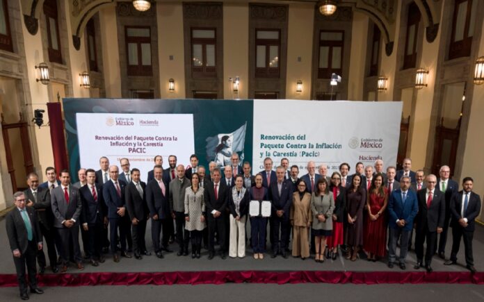 18.11.2025 Ciudad de México.- En Palacio Nacional, la presidenta Claudia Sheinbaum Pardo firmó, junto con empresarios, la renovación del Paquete contra la Inflación y la Carestía (Pacic), que mantiene el costo de la canasta básica en 910 pesos.
