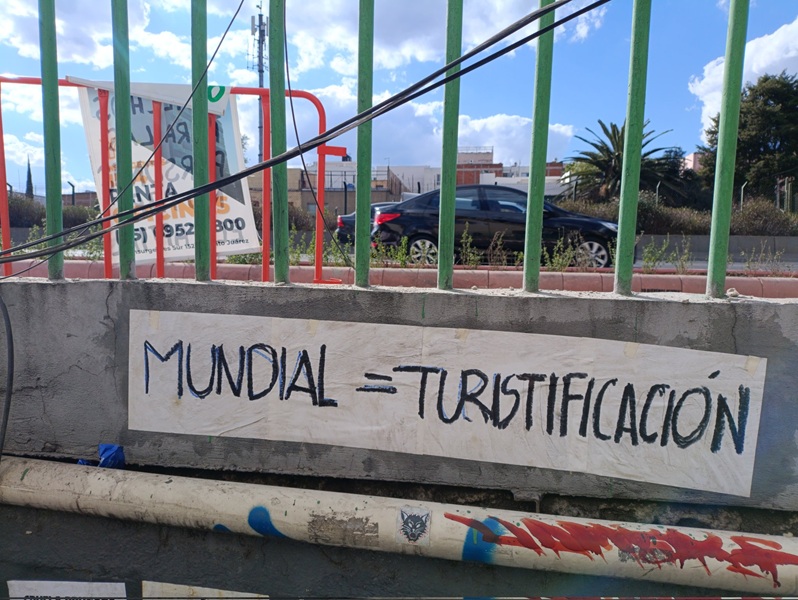 Los activistas y colectivos, como el Frente Anti-Gentrificación CDMX y #YoPorLas40Horas, también pegaron cartulinas y realizaron pintas con mensajes como “Mundial = turistificación”, “No queremos Mundial, queremos agua”, “Se disparan desalojos por futbol” y “México no es un producto para tu entretenimiento”.