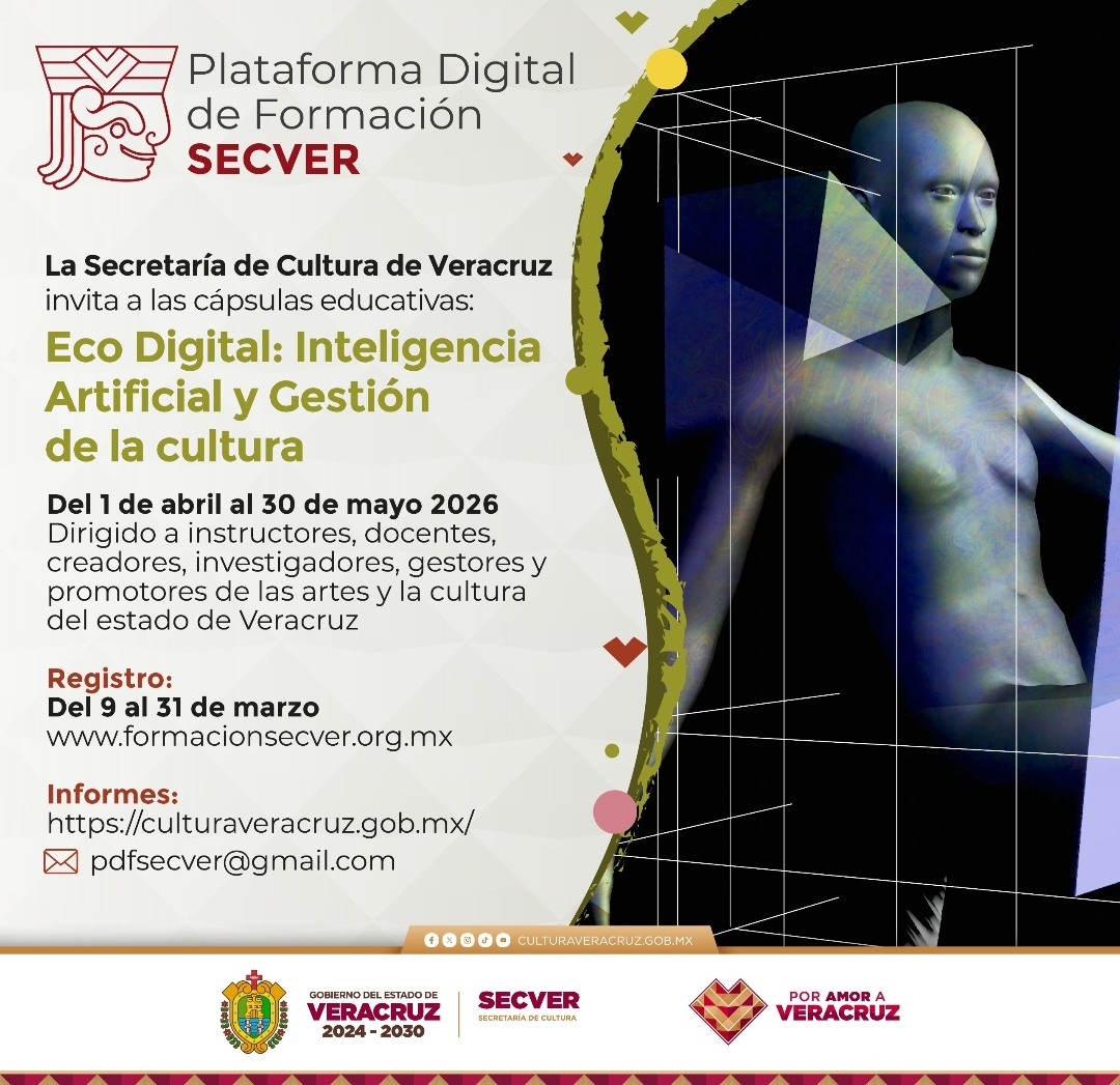 Xalapa, Ver.,11 de marzo de 2026.- La Secretaría de Cultura de Veracruz (SECVER) invita al público a participar en la serie de cápsulas educativas Eco Digital: Inteligencia Artificial y Gestión de la Cultura 2026, que se transmitirá del 07 de abril al 30 de mayo a través de la Plataforma Digital de Formación SECVER, disponible en el portal https://www.formacionsecver.org.mx/.