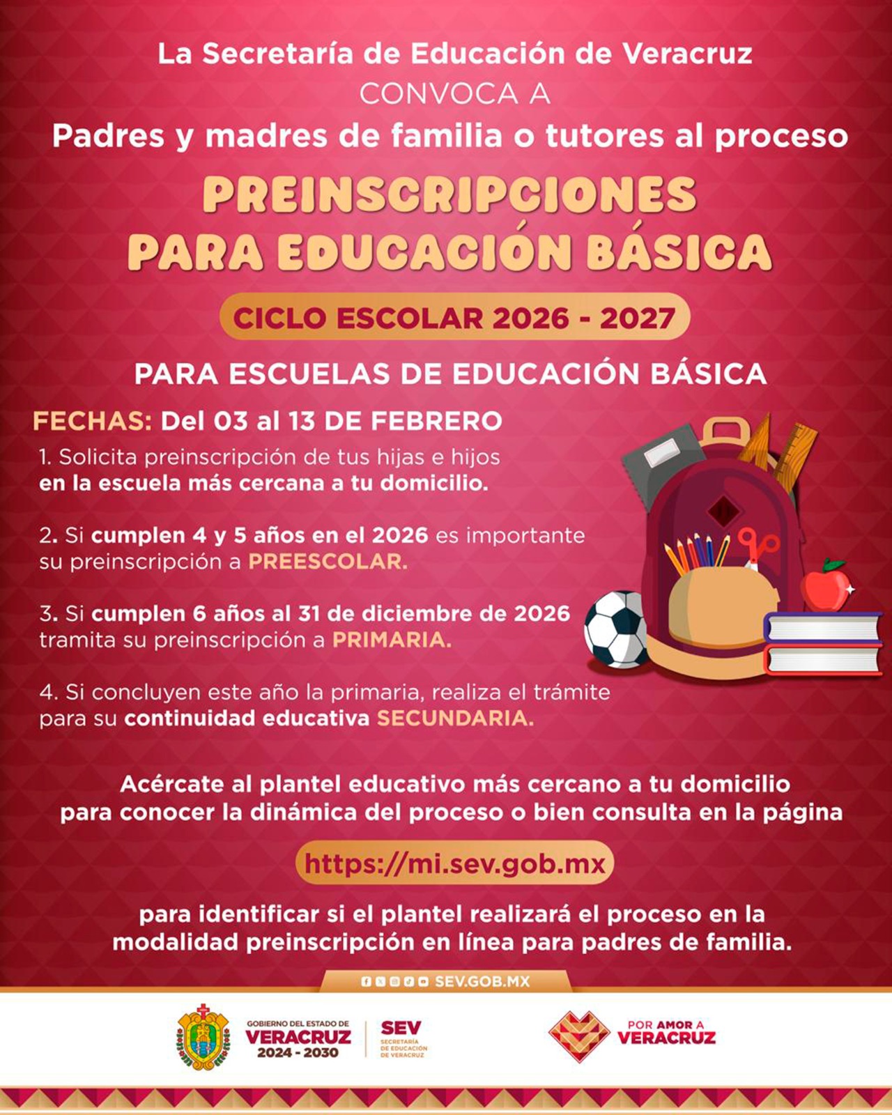 Xalapa, Ver., 25 enero de 2026.– La Secretaría de Educación de Veracruz (SEV) informa que del 03 al 13 de febrero tendrá lugar el proceso de preinscripciones para escuelas públicas y privadas de Educación Básica, correspondiente al ciclo escolar 2026–2027.