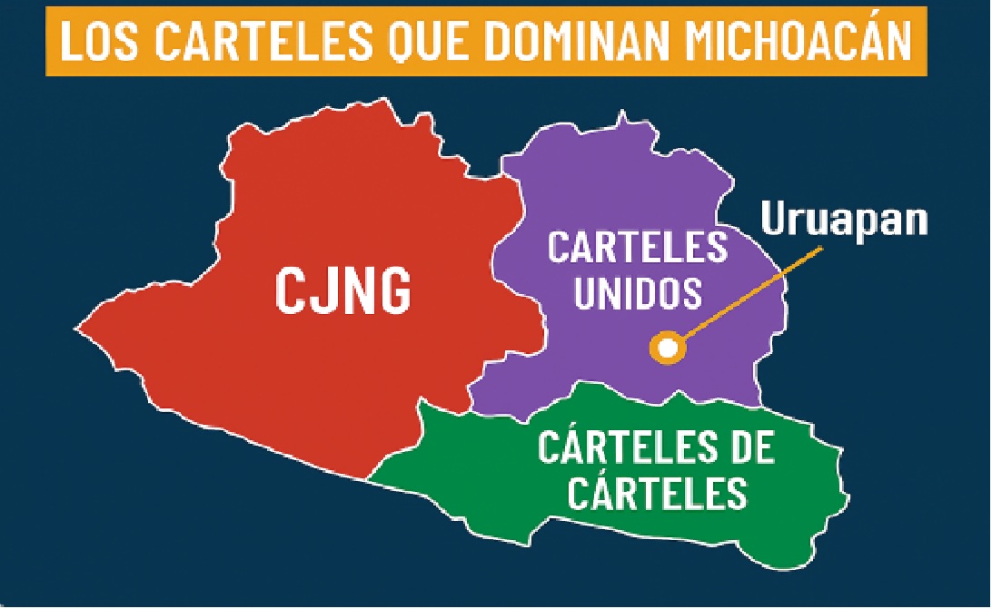 Uruapan es una ciudad clave por su ubicación geográfica, su actividad agrícola (especialmente aguacatera) y su conectividad con otras regiones del estado. Por ello, ha sido escenario de múltiples enfrentamientos entre cárteles y de ataques contra autoridades locales, como el reciente asesinato del presidente municipal Carlos Manzo Rodríguez.