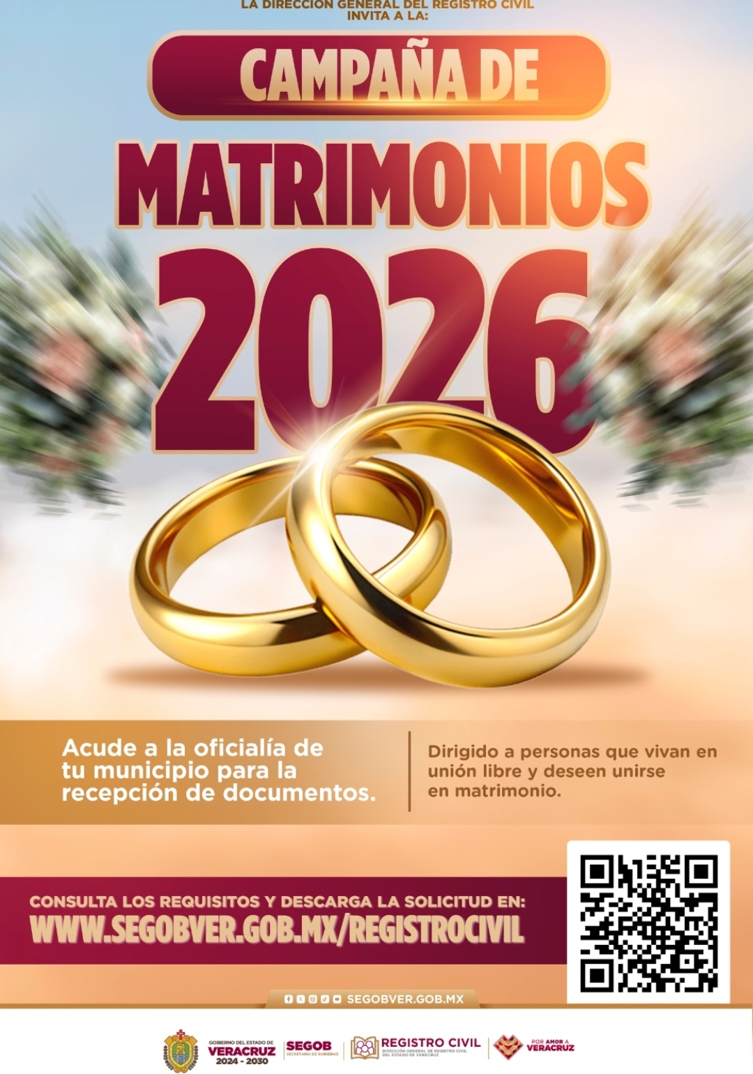 Xalapa, Ver., 15 de enero de 2026.- La Secretaría de Gobierno, a través de la Dirección General del Registro Civil, invita a las parejas que viven en unión libre a participar en la Campaña de Matrimonios 2026, la cual se realizará de manera simultánea en los 212 municipios de la entidad.