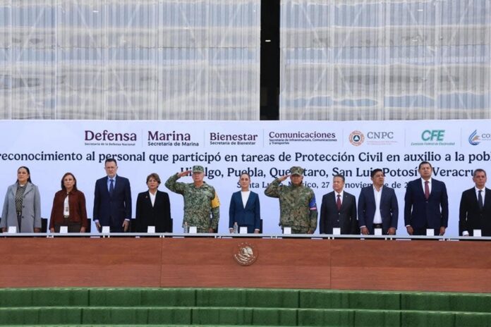 También se hizo un reconocimiento puntual al funcionariado de la Secretaría de Bienestar, la Coordinación Nacional de Protección Civil, la Comisión Federal de Electricidad, Comisión Nacional del Agua y otras que, desde sus áreas de responsabilidad, operaron centros de mando, coordinaron rutas de apoyo, garantizaron el suministro de insumos y mantuvieron comunicación permanente con los municipios afectados.