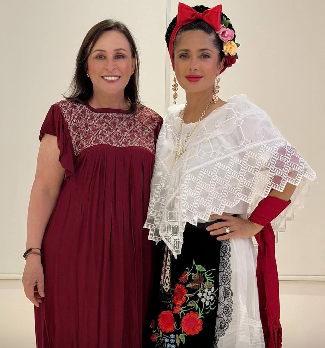 La publicación estuvo acompañada de dos imágenes: en una, Salma Hayek aparece luciendo el atuendo típico veracruzano; en la otra, se le ve junto a Rocío Nahle, ambas sonrientes.