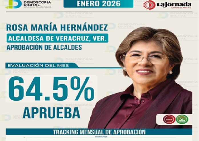 Veracruz, Ver. 05 febrero 2026.- La alcaldesa de Veracruz, Rosa María Hernández Espejo, obtuvo el primer lugar del ranking estatal de alcaldes correspondiente al mes de enero, con una aprobación del 64.5 por ciento, de acuerdo con una encuesta de la casa encuestadora “Demoscopia Digital”.