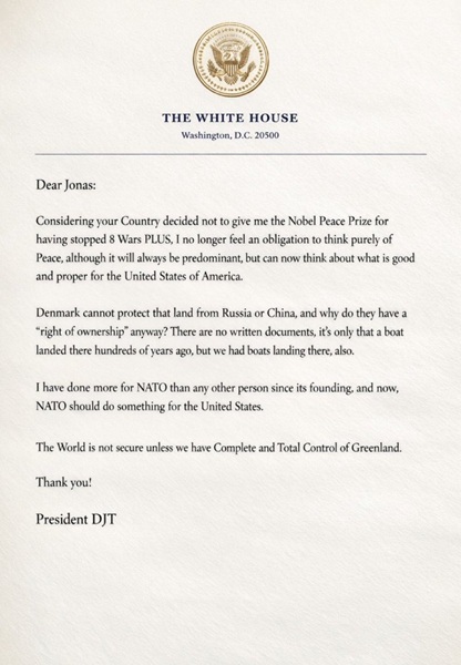 Sin embargo, el tono de esta nueva carta sugiere un nivel de presión mucho más elevado, al utilizar el prestigio de una institución global como el Premio Nobel de la Paz como moneda de cambio para la expansión territorial y el control estratégico.