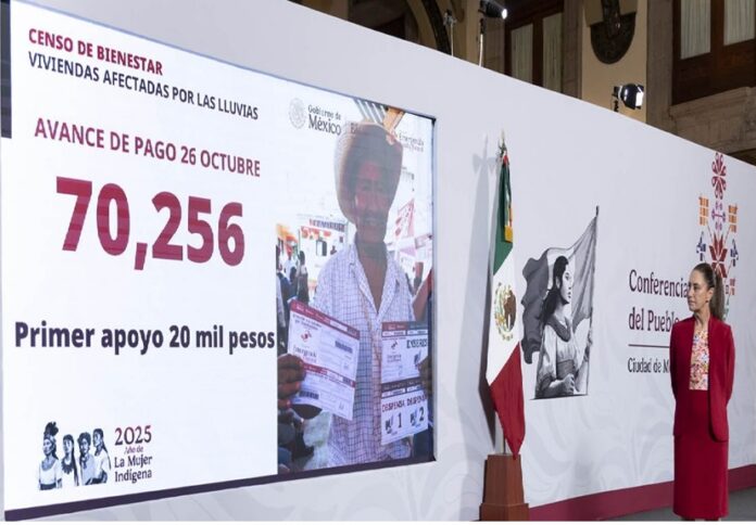 27.10.2025 Ciudad de México.- El Gobierno de México, a través de la Secretaría de Bienestar, informó que, al 26 de octubre, 70 mil 256 personas han recibido el primer apoyo de 20 mil pesos, así como dos vales de despensa y uno de enseres, por las afectaciones a causa de las lluvias extraordinarias registradas a comienzos de octubre en Veracruz, Hidalgo, Puebla, San Luis Potosí y Querétaro.