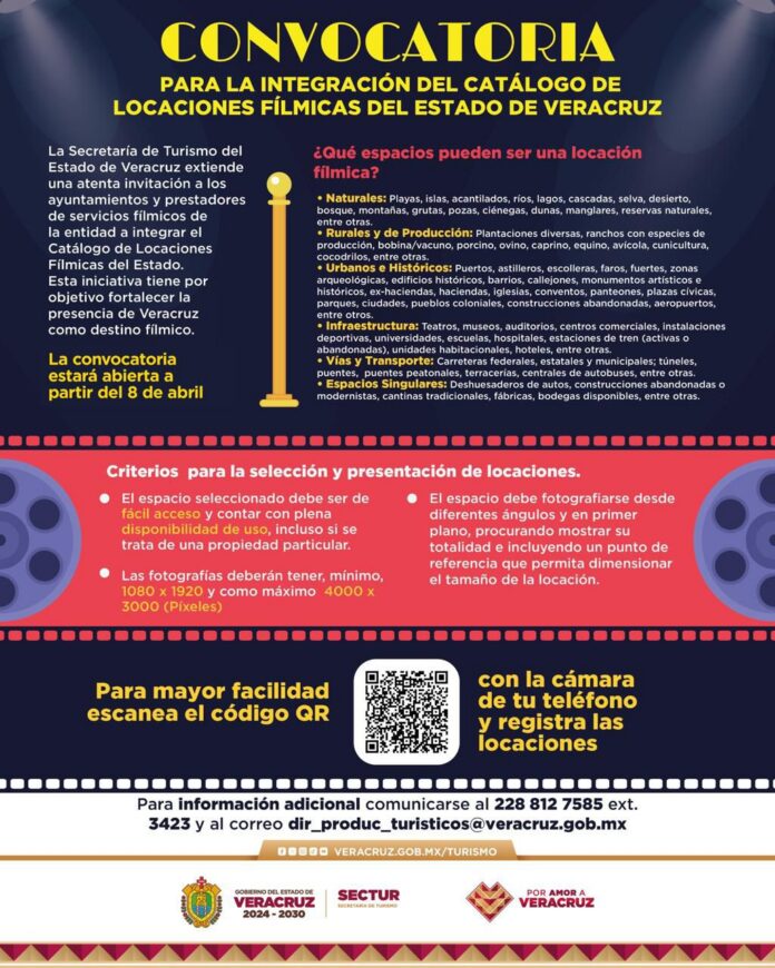 Xalapa, Ver.,14 de abril de 2026.- La Secretaría de Turismo convoca a ayuntamientos y prestadores de servicios a integrar el Catálogo de Locaciones Fílmicas del Estado, con el objetivo de proyectar la presencia de la entidad como destino para la industria audiovisual.