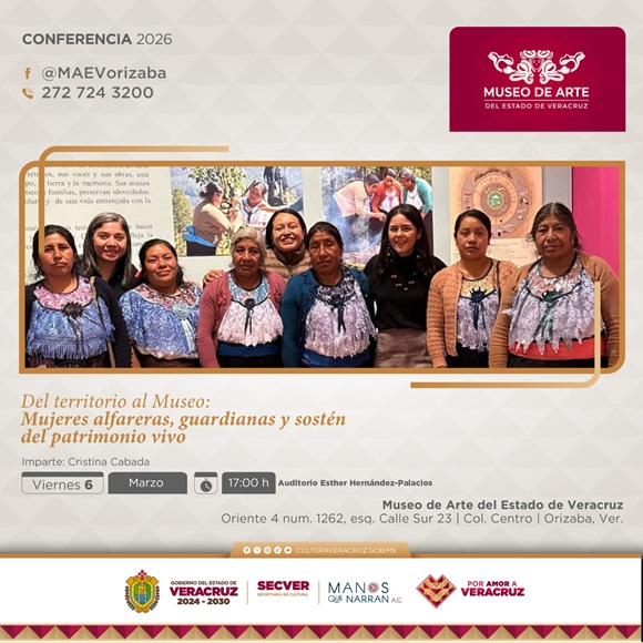 Xalapa, Ver., 05 de marzo de 2026.- En el marco de la conmemoración del Día Internacional de la Mujer, la Secretaría de Cultura de Veracruz (SECVER) invita a la conferencia Del territorio al museo: mujeres alfareras, guardianas y sostén del patrimonio vivo, el viernes 06 de marzo a las 17:00 horas en el Museo de Arte del Estado de Veracruz (MAEV), en la ciudad de Orizaba.