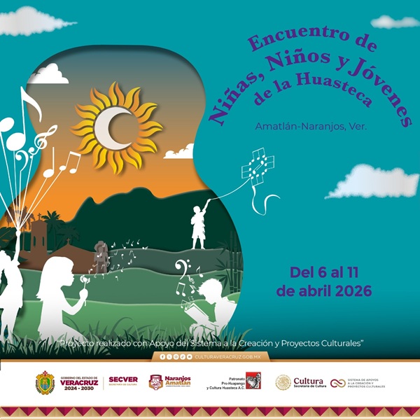 Xalapa, Ver., 01 de abril de 2026.- La Secretaría de Cultura de Veracruz (SECVER) invita al Encuentro de Niñas, Niños y Jóvenes de la Huasteca, del 06 al 11 de abril en el municipio de Naranjos Amatlán. La entrada es libre.