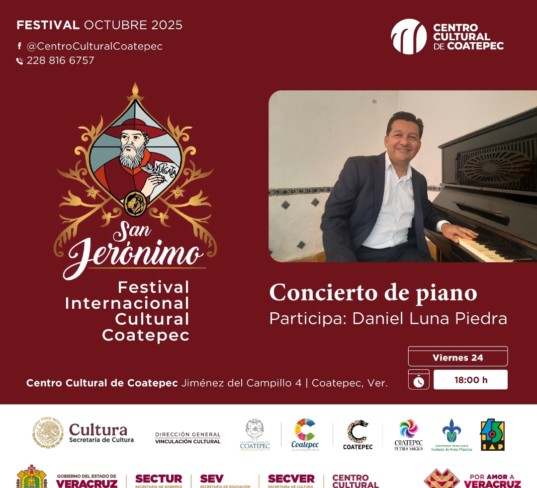 Xalapa, Ver., 24 de octubre de 2025.- La Secretaría de Cultura de Veracruz (SECVER) invita a disfrutar de los conciertos de Piano y Marimba que tiene preparados para este viernes 24 de octubre en el Centro Cultural de Coatepec. Las actividades son gratuitas.
